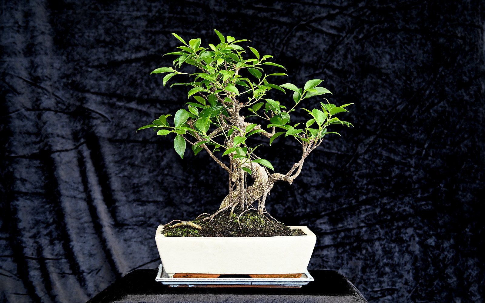 Tigerbark figen i en flot firkantet hvid potte. Underskål medfølger.